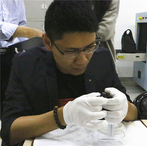 常务副会长·专家库成员蔡奇龙细致观察检品